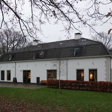 KOETSHUIS onderdeel 6. Ten westen van het huis gelegen voormalig koetshuis daterend rond het midden van de negentiende eeuw, dat in 1979 sterk is gerestaureerd en thans deels in gebruik als informatiecentrum en deels als woning. Het gepleisterde pand bestaat uit één bouwlaag op een rechthoekige plattegrond en heeft een met gesmoorde, opnieuw verbeterde pannen gedekt mansarde schilddak. Alle gevelhoeken zijn voorzien van gepleisterde hoekblokken en een zwart geschilderde plint. De voorgevel (oost), die thans als achtergevel functioneert, heeft een symmetrische indeling met een hoger opgetrokken middengedeelte dat een flauw hellend zadeldak heeft. Op de begane grond van dit middendeel bevinden zich twee moderne inrijdeuren met daartussen een smal hoog venster met ruitvormige roedenverdeling. Op de verdieping is in het midden een rondboogvenster aangebracht dat aan weerszijden wordt geflankeerd door drie spaarnissen. Op de begane grond bevinden zich verder enkele stolpvensters en een deur. De overige gevels zijn sober en vlak vormgegeven.
