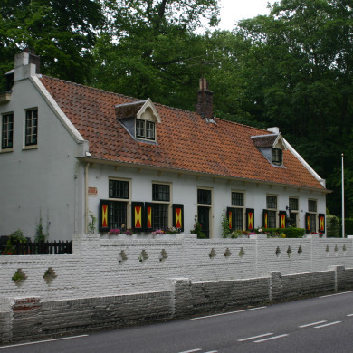 DIENSTWONING 'T HOOGJE. Direct aan de Stationsweg, tegenover de oprijlaan staan twee witgepleisterde woningen uit de 18de eeuw van één bouwlaag onder een met Oud-hollandse pannen gedekt zadeldak met een tuitgevel aan de kopzijden. In de kapgevel twee dakkapellen met elk twee meerruitsvensters onder een zadeldak met houten windveren. Regelmatige indeling van de voorgevel bestaande uit zeven (venster/deur)assen, 18de-eeuwse meerruitsvensters met roeden en halve luiken en bovenlichten. Aansluitend op het dakschild van de achtergevel een houten aanbouw onder lessenaarsdak en een stenen schuur.