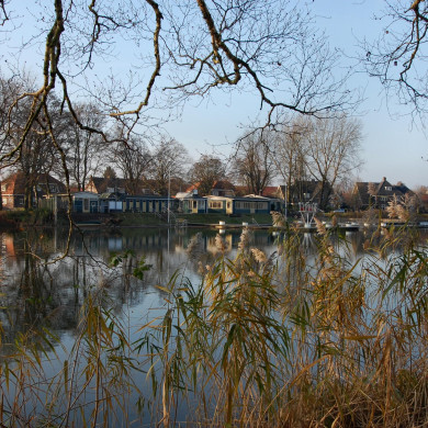 De twee bassins zijn in het zuidelijke deel van de vijver aangelegd, met rechts erachter (ZW) het pompgebouwtje. Op de oever aan de zuidkant staat - vanaf het water gezien - vooraan het badmeesterskantoortje, daarachter (Z) zijn de wisselkabines voor dames gebouwd, en rechts (O) de kinderkleedkamer en het daaraan vastgebouwde woonhuis. Oorspronkelijk was hier de ligwei. Zuidelijk van de kinderkleedkamer ligt de betonnen vloerplaat van de verdwenen wisselkabines voor heren.