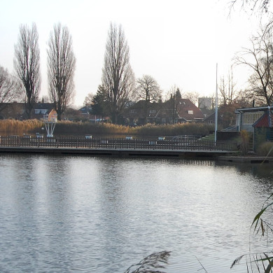 De twee bassins zijn in het zuidelijke deel van de vijver aangelegd, met rechts erachter (ZW) het pompgebouwtje. Op de oever aan de zuidkant staat - vanaf het water gezien - vooraan het badmeesterskantoortje, daarachter (Z) zijn de wisselkabines voor dames gebouwd, en rechts (O) de kinderkleedkamer en het daaraan vastgebouwde woonhuis. Oorspronkelijk was hier de ligwei. Zuidelijk van de kinderkleedkamer ligt de betonnen vloerplaat van de verdwenen wisselkabines voor heren.