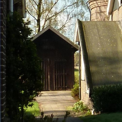 Rechthoekige, gepotdekselde KOLENSCHUUR onder een pannen gedekt zadeldak.