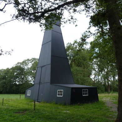 Geteerde houten toren (nr. 27), die zich naar boven verjongt onder een getoogd dakje. De toren is samengesteld uit een houten gebintwerk, geplaatst op betonnen poeren en bekleed met staande houten delen. De vloer is met oorspronkelijke klinkers bestraat. In de toren rechtgesloten houten vensters met roedenverdeling.