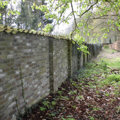 TUINMUUR. Nabij de tuinmanswoning staat een negentiende-eeuwse moestuinmuur gemetseld uit een groot formaat baksteen. De muur wordt door pijlers geleed en afgesloten door een dubbele rij dakpannen.
