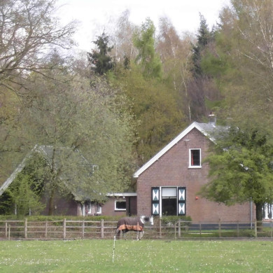 DUBBELE ARBEIDERSWONING. Aan de rand van het bos staat een bakstenen woning uit 1900 gebouwd in opdracht van de toenmalige eigenaresse A.C. Luden. Het op rechthoekige grondslag opgetrokken pand bestaat uit één bouwlaag met witgepleisterde plint onder een met vernieuwde Hollandse pannen gedekt zadeldak met twee gemetselde schoorstenen op de nok. De zesassige voorgevel is naar de bouwlanden toegekeerd en heeft een invulling van schuifvensters met luiken en een excentrisch geplaatste toegangs paneeldeur met bovenlicht. In het dakschild bevinden zich twee dakkapellen met voluutvormige wangen. Tegen de achtergevel is een klein aanbouwtje waarin een tweede toegangsdeur met rechts hiervan een T-venster met luiken en links hiervan vierruitsvensters.