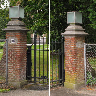 De HEKPIJLERS aan de J.F. Kennedylaan dateren uit 1912. Ze zijn opgetrokken uit baksteen en hebben een hardstenen geprofileerde bekroning. Tegen de vierkante pijlers is aan de tuinzijde een gebogen steunbeertje gemetseld. Aan de voorzijde is in elke pijler een hardstenen ovaal gemetseld. De pijlers staan op hardstenen voet.