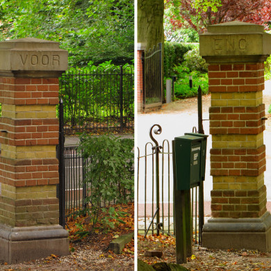 Een tweede paar hekpijlers staat voor de dienstwoning bij de tweede toegang tot de villa. Dit paar is identiek aan de hekpijlers aan de Eemnesserweg.