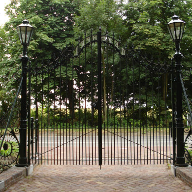 TWEE TOEGANGSHEKKEN. Twee giet- en smeedijzeren, 18de/19de-eeuwse toegangshekken aan de Delftweg die de entrees tot de buitenplaats markeren. De hekken staan op uitzwenkende bakstenen keermuren met bakstenen brugdek en bestaan ieder uit twee gegoten kolommen, waartussen twee draaibare smeedijzeren vleugels met geschulpte bovenzijden. Aan de buitenzijde van de kolommen een voluutvormig zijstuk. Op de keermuren staan ijzeren leuningen.