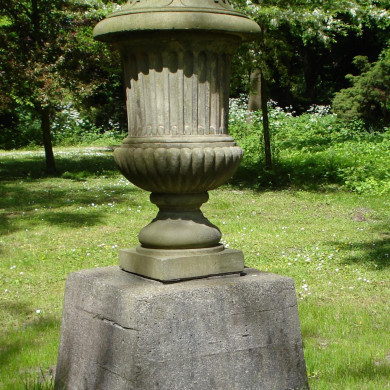 TUINVAAS. Grote tuinvaas, uitgevoerd in Bentheimer zandsteen, datering eerste kwart 18de eeuw, staande op een betonnen sokkel van recente datum (ca. 1990) die wegens te geringe ouderdom voor de bescherming van ondergeschikt belang is.
