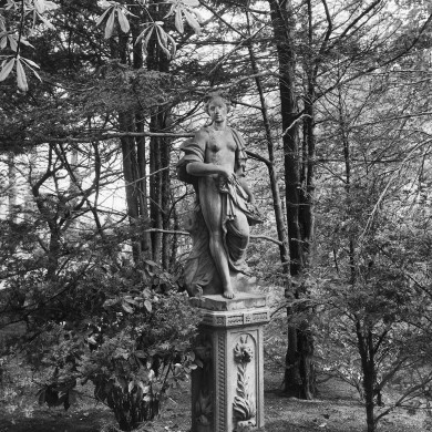 TUINBEELD OP VOETSTUK: 'FLORA'. Natuurstenen tuinbeeld, voorstellende 'Flora' uit ca. 1730-1750, mogelijk afkomstig van de buitenplaats Zijdebalen en in 1820 voor de buitenplaats De Tempel aangekocht door de familie Criellaert. Het beeld staat op een voetstuk uit ca. 1900 waarvan de vier zijden zijn gedecoreerd met in potten staande lelies.