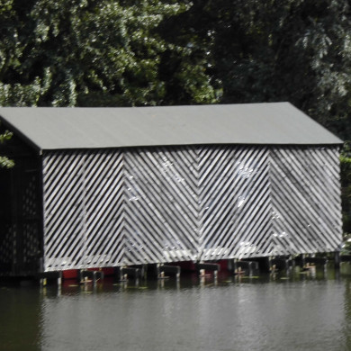 Op de kaart nr.5. BOTENHUIS. Voor het huis aan de Vecht gelegen rechthoekig houten botenhuis uit ca.1920. Aan drie zijden diagonale schroten in V-verband en open constructie; de oostgevel is dicht uitgevoerd; onder een flauw hellend zadeldak.