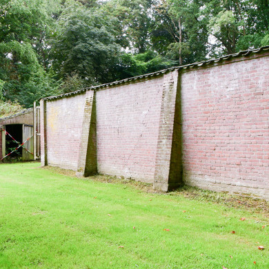 - bakstenen muur tussen voormalige rozen- en moestuin, met poort en hek, overgaand in lange lage schuur, uitgevoerd in baksteen en voorzien van een lessenaarsdak gedekt met gesmoorde kruispannen;