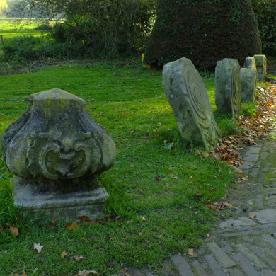 MARKERENDE ELEMENTEN AAN HET BEGIN VAN DE ZUIDELIJKE OPRIJLAAN, TEGENOVER DE HOOFDPOORT, XVIII-XIX: zes losse natuurstenen elementen, deels behouwen, deels onbehouwen waaronder twee sokkels, beide voorzien van een gesmeed ijzeren muuranker.