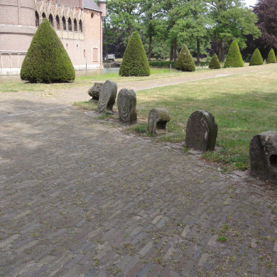 Inleiding HISTORISCHE BUITENPLAATS KASTEEL HEESWIJK. Omgracht kasteel met hoofdgebouw en kelders gebouwd op grondslagen (ijzeroer) uit de 12de eeuw met aanpassingen en uitbreidingen tot in de 20ste eeuw, bestaande uit een omgrachte voorburcht met poort (16de eeuw), een geometrisch lanenpatroon ten noorden en ten westen van het kasteel plus een orthogonaal terrein binnen dit lanenpatroon (uit de 18de eeuw) terwijl uit de 19de eeuw een bescheiden landschapsstijl met een eilandje in de kasteelgracht, het oeververloop van een deel van deze gracht en de slingerende laan in noordelijke richting dateren; gedeeltelijk met klinkers (waalformaat) bestrate oprijlanen uit circa 1880 in noordoostelijke en zuidwestelijke richting, eveneens uit omstreeks 1880 dateren landschappelijk geplaatste boomgroepen ten noordoosten van het kasteel, de omgrachte moestuin (voorheen sterrebos) met muur en kas alsmede diverse toegangsbruggen, de dienstwoning aan de oprijlaan, de kleine omgrachte tuin aan de overzijde van de poort (aan de zuidzijde van de dwarslaan), talrijke natuur- en bakstenen ornamenten, pijlers, beelden en sculpturen (op de meest onverwachte en verwachte plaatsen aan te treffen) en ten slotte een tuin in neo-formele stijl uit 1939 naar ontwerp van L. Copijn op het terrein van de voorburcht. Op het kasteelterrein zijn enkele lanen nog geplaveid met de oude bestrating in de vorm van gebakken klinkers in waalformaat, wisselend van formaat en onregelmatig van vorm: zuidelijke oprijlaan, de noordoostelijke oprijlaan (de beukenlaan, tevens bekend als Aalmoezenier Francis L. Sampsonlaan).
