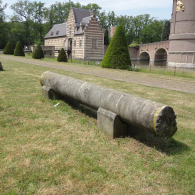 VIER MARMEREN ZUILSCHACHTEN, AFKOMSTIG VAN HET ALTAAR VAN DE SINT JANSKATHEDRAAL TE 'S-HERTOGENBOSCH: losse, monolithische zuilschachten ten zuiden van het kasteel begin jaren '80 van de 20ste eeuw in het park geplaatst, naar ontwerp van meester-steenhouwer Joris Duer en in 1620 vervaardigd door Hans van Mildert uit Antwerpen als onderdelen van het hoofdaltaar van de Sint Jan; in 1867 afgebroken en in gedeelten verkocht.