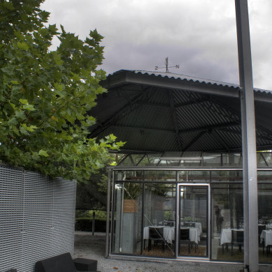 De kapberg bezit een zeszijdig dak dat met golfplaten is bekleed en op drie ijzeren stijlen rust. Onder het dak is een groot, glazen volume geplaatst dat dienst doet als eetzaal voor het restaurant.