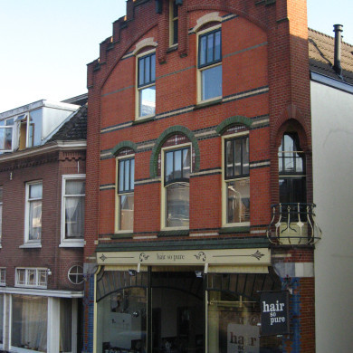 De winkel met bovenwoning is op een rechthoekige plattegrond over twee bouwlagen opgetrokken onder een mansardekap met gesmoorde opnieuw verbeterde Hollandse pannen. De voorgevel is boven een hardstenen plint met basreliëfs opgemetseld in oranje verblendsteen met horizontale sierbanden en bogen boven de vensters in gele, groene en zwarte verblendsteen. Groen geglazuurde waterdorpels onder de vensters. Op de hoeken wordt de gevel afgesloten door lisenen van rode verblendsteen. De gevel eindigt aan de bovenkant in een segmentboogvormige band van rode verblendsteen, voorzien van kantelen met ezelsruggen. In het midden van de band een klein venster met een hijsbalk onder een luifeltje. De begane grond wordt in beslag genomen door een centraal geplaatste ingang tussen twee etalages. De ingang bestaat uit een glasdeur met een houten stootbord onder een bovenlicht. Vloeiende Art Nouveau roedeverdelingen in de deur, het bovenlicht en de etalageruiten. Aan weerszijden van de etalages postamenten met rode en blauwe geglazuurde stenen. Op de verdiepingen en in de geveltop rechtgesloten vensters met drie ruitsbovenlichten onder segmentbogen. Een schaakbordpatroon van verschillende kleuren tegeltjes in de boogtrommels. Rond het bovenlicht van het middelste venster op de eerste verdieping een hoefijzerboog, die in de gebogen raamroede herhaald wordt. Een overhoeks balkon met een uivormig ijzeren balkonhekje onder een spitsboogvormige uitsnijding in de liseen op de noordwestelijke hoek. In de gepleisterde zijgevel (west) rechtgesloten vensters met waterdorpels onder lateien met basreliëfs.
