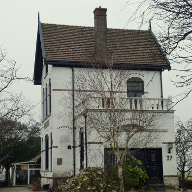 Voormalig tramstation, in wit gepleisterde baksteen opgetrokken op een samengestelde plattegrond onder zadeldaken. Het gebouw wordt gekenmerkt door versieringen met diverse soorten baksteen boven de vensters en horizontale over de gevels doorlopende niet gepleisterde lijnen. Het gebouw is twee bouwlagen hoog. Het middengedeelte met drie vensterassen heeft een zadeldak bedekt met grijze Tuiles du Nord en golfplaten, en is voorzien van overstekken. De zuidelijke zijvleugel met twee vensterassen springt iets terug ten opzichte van het middengedeelte. De nokrichting van het zadeldak, bedekt met rode Tuiles du Nord (westelijk dakschild) en rode kruispannen (oostelijk dakschild), met overstek, staat haaks op de nokrichting van het middengedeelte. Oorspronkelijk waren de drie geveltoppen voorzien van een makelaar. De noordelijke éénlaagse aanbouw, met eveneens iets terugliggende rooilijn heeft één vensteras. Het platte dak dient tevens als dakterras en heeft een houten balustrade. De vensters en ingangen bevatten oorspronkelijk alle een bovenlicht met zes-, acht-, negen- of twaalf-ruiters van gekleurd glas. Ter hoogte van de tussendorpels zijn de gevels geleed met horizontale banden van donker verglaasde baksteen. Hetzelfde type baksteen is ook aangewend om de gebogen strekken boven de vensters en ingangen een accent te geven. De vensters en ingangen zijn daarnaast voorzien van boogvelden die zijn gedecoreerd met meerkleurige, ruitvormige tegeltjes.