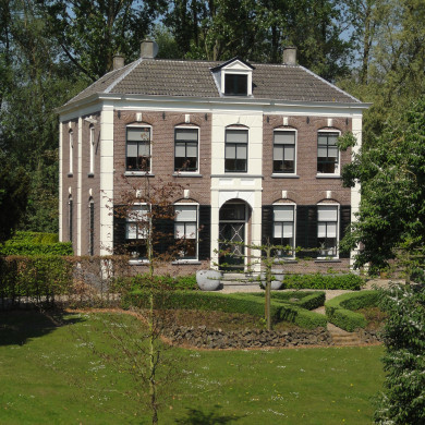 De symmetrisch ingedeelde VOORGEVEL (zuidoostgevel) heeft een gepleisterde middenrisaliet met blokmotief in een witte kleur. Op de begane grond heeft deze risaliet een halfrond afgesloten portiek met daarin de entree, bestaande uit een dubbele (niet oorspronkelijke) houten deur met enkelruits bovenlicht. Een hardstenen trap (twee optreden) leidt naar het portiek. Het deurkozijn rust op hardstenen neuten en er is een hardstenen dorpel aanwezig. De kozijnen zijn wit geschilderd en ramen en deuren zijn voorzien van een donkergroene kleur. Links en rechts daarvan bevinden zich twee rechthoekige vensteropeningen met T-schuiframen en houten, donkergroen geschilderde persiennes. De verdieping heeft vijf rechthoekige vensteropeningen met T-schuiframen. Boven de risaliet bevindt zich een dakkapel onder een zinken zadeldak met tweeruits stolpraam. De wangen van de dakkapel bestaan ook uit zink. De voorzijde van de dakkapel wordt afgesloten door een driehoekig, houten en wit geschilderd fronton. De windveren zijn donkergroen geschilderd.