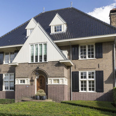 VILLA, "De Karekiet", gebouwd in 1928 in een heroriëntatie-stijl die is geënt op traditionele wijze toegepaste stijlmotieven, maar die ook moderne uitingen overneemt. De ingangspartij heeft reminiscenties aan de Amsterdamse School, terwijl de schoorstenen met het 'board en batten'-motief invloeden van de Nieuwe Haagse School bezit.