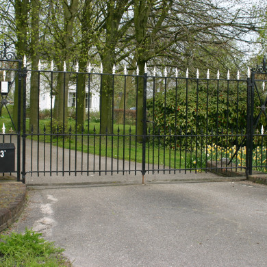 Smeedijzeren inrijhek met naam buitenplaats. Lodewijk XVI trant.