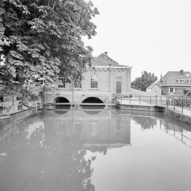 De beide zijgevels zijn langs de dakrand gedecoreerd met een gekanteeld fries. Het voorste bouwdeel heeft in beide zijgevels drie rechthoekige tweelicht vensters, voorzien van een natuurstenen waterdorpel en aan drie zijden omgeven door een rollaag met natuurstenen blokjes. In het achterste, lagere bouwdeel zijn aan deze gevelzijde drie rechthoekige vensters geplaatst. In de linker zijgevel bevindt zich een deur onder een bovenlicht. De achtergevel is onderlangs de dakrand een versiering aangebracht met een uitgemetseld kantelenfries en komen drie meerruitsrondboogvensters en een eenvoudige deur onder een bovenlicht voor. Dit achterste bouwdeel waarin de machinekamer gehuisvest is, is deels over de maalkolk gebouwd en heeft aan de onderzijde twee halfronde openingen. Daarboven is in het verlengde van de gepleisterde plint een gepleisterde band aangebracht, die over de gevel als plint doorloopt. De half ellipsvormige gemetselde maalkolk voor het gebouw is omgeven door een ijzeren hekwerk met balusters.