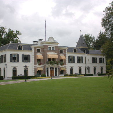 HOOFDGEBOUW. Onderkelderd rode bakstenen, grotendeels gestuct hoofdgebouw in oorsprong daterend uit de 17de eeuw of eerder. In 1807 is het huis door de toenmalige eigenaar mr. Willem Hendrik de Beaufort verbouwd tot een middenstuk met twee zijvleugels in neoclassicistische stijl, zoals thans nog aanwezig. Door het toen geldende bouwverbod van overheidswege konden voor deze verbouwing geen nieuwe bouwmaterialen aangevoerd worden, zodat De Beaufort genoodzaakt was het oude huis zoveel mogelijk te sparen en verder gebruik te maken van oude bouwmaterialen waarvoor deze een buitenplaats aan de Vecht liet afbreken om de benodigde bouwkundige onderdelen, zoals deuren, dorpels en kozijnen te verkrijgen. Deze omstandigheid verklaart de eigenaardige verhouding van het middenstuk ten aanzien van de zijvleugels. Aan het einde van de 19de eeuw is het huis ingrijpend verbouwd en met een toren en eenlaagse aanbouw tegen de zuidgevel uitgebreid (zie foto uit ca.1910). In 1949 is het pand door architect ir. G. Pothoven nogmaals verbouwd, waarbij de aanbouw met een verdieping is verhoogd en de gietijzeren wintertuin aan de achterzijde is vervangen door een serre. Het huidige rechthoekige gebouw bestaat uit een bakstenen middenstuk van drie bouwlagen geflankeerd door gestucte zijvleugels van twee bouwlagen onder een met blauwe Oud-Hollandse pannen gedekt afgeplat schilddak. Aansluitend tegen de zuidgevel staat een op vierkante grondslag opgetrokken, gewitte toren (trappenhuis) van drie bouwlagen onder een met driehoekige leien in maasdekking gedekt vierzijdig puntdak bekroond door een vergulde windvaan. Tegen de toren staat een rechthoekige gestucte en gewitte aanbouw van twee bouwlagen onder een met gesmoorde Hollandse pannen gedekt afgeplat schilddak. Het middengedeelte en de vleugels staan op een hardstenen voet, die aan de zij- en achtergevel in een gestucte voet met speklagen en in de aanbouw in een gestucte voet overgaat. De voorgevel heeft ter hoogte van de verdieping een hardstenen kordonlijst, het huis wordt door een kroonlijst afgesloten. De ingangspartij is gelegen aan de voor(west)zijde van het huis in de centrale travee van het middengedeelte, die hoger is opgetrokken dan de zijtraveeën en wordt afgesloten door een brede kroonlijst waarboven een cirkelvormig kuifstuk met wangen. Aan een hardstenen bordes van twee treden bevindt zich een dubbele houten toegangsdeur met paneelvakken en een getoogd enkelruits bovenlicht met aan weerszijden een langgerekt venster met enkelruits bovenlicht en paneelvak aan de onderzijde. De vensters en deur zijn gevat in een pilasterstelling die onderdeel uitmaakt van gestuct lijstwerk, waarmee de ingangspartij en de centrale travee van het middengedeelte een extra accent krijgen. De vier pilasters worden bekroond door voluutvormige consoles, die een houten rechthoekig balkon met een balustrade van balustervormige spijlen ondersteunen. Op de verdieping een ensemble van twee balkondeuren met tweeruitsindeling en enkelruitsbovenlicht, dat door lijstwerk wordt omgeven en door een timpaan wordt bekroond. Erboven ter hoogte van de tweede verdieping zijn twee gekoppelde omlijste mezzaninovensters. In de zijtraveeën bevinden zich eveneens omlijste vensters: begane gronds een T-venster, op de verdieping een vierruitsvenster bekroond door een timpaan en op de tweede verdieping een mezzaninovenster. Onder enkele vensters op de begane grond een horizontaal diefijzer. De twee-assige zijvleugels vertonen aan de voorzijde twee tot de voet doorgetrokken zesruitsvenster met halfronde bovenlichten voorzien van spaakroeden gevat in een rechthoekige omlijsting met kroonlijst, op de verdieping twee zesruitsvensters met persiennes eveneens gevat in een omlijsting met kroonlijst en een halfronde tweeruits dakkapel. In de ten aanzien van de zijvleugel iets terugliggende toren een door een hardstenen bordes van twee treden voorafgegane smalle dubbele zesruitsdeur met halfrond tweeruits bovenlicht. De bordestrap wordt aan weerszijden door een rechte met hardsteen beklede sokkel begrensd en is van een glazen luifel voorzien. Op de eerste verdieping twee door omlijsting aangekoppelde hoge enkelruitsvensters met rondboog bovenlicht, in de tweede verdieping, die met leien is bekleed, een keperboogvormig vierruitsvenster. De torenkap vertoont aan deze zijde een klein driehoekig, licht naar voren zwenkende dakkapel met spitsboogruitvenster. Aansluitend de aanbouw, waarvan het gevelvlak iets naar voren springt en waarin zich één travee van een slank tweeruitsvenster met halfrond bovenlicht en een halfrond tweeruitsvenster bevindt. De voorgevel heeft op de begane grond rechts een vierruitsvenster met halfrond bovenlicht voorzien van spaakroeden gevat in een rechthoekige omlijsting en op de verdieping twee zesruitsvensters. In de rechtergevel een halfrond enkelruitsvenster. In de achtergevel van de aanbouw op de begane grond twee zesruitsvensters met halfronde bovenlichten voorzien van spaakroeden en op de verdieping twee zesruitsvensters. Aansluitend de achtergevel van de toren met een keldervenster met diefijzers en daarboven, het verspringende verloop van het trappenhuis volgend, drie slanke halfronde tweeruitsvensters met diefijzers. De tweede verdieping en de toren kennen hetzelfde aanzicht als de voorzijde. In de hoek van de toren en de vleugel is een houten laat-19de-eeuwse serre staande op een voet waarin een halfrond gietijzeren venster met spaakroeden en onder een met leien gedekt afgeplat schilddak met gebogen schilden. In de serre grote meerruitsvensters met bovenlichten en paneelvakken aan de onderzijde. Rechts van de serre twee souterrainvensters en twee meerruitsvensters met bovenlichten, op de verdieping drie zesruits schuifvensters met persiennes, hierboven twee vierruits dakkapellen. De twee zijvleugels aan weerszijden van het middenstuk kennen een identieke gevelindeling met drie vensterassen opgebouwd uit een souterrainvenster, een zesruitsvenster met halfrond bovenlicht voo