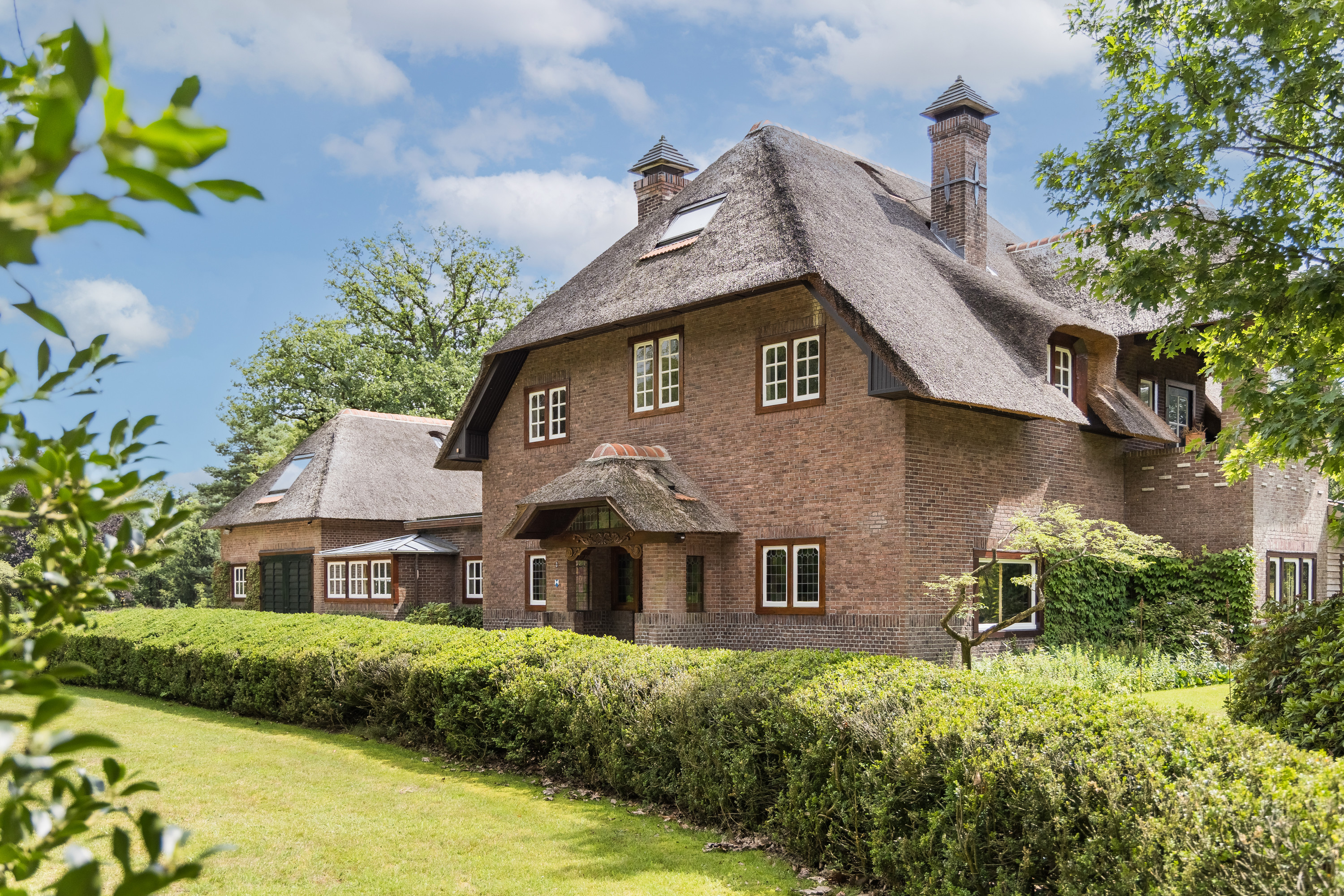 Landhuis met aangebouwde garage op rechthoekige plattegrond opgetrokken in bruine machinale baksteen onder met rietgedekte overstekende zadeldaken met wolfeinden.