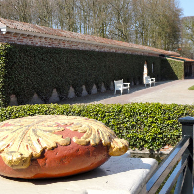 TUINMUUR MET TWEE KASSEN. Als pendant van het schathuis een 18de-eeuwse muur van kloostermoppen afgewerkt met een schijngoot en drie lagen dakpannen. Tegen de zuidwestzijde van de tuinmuur twee 19de-eeuwse kassen staande op een bakstenen fundament. De kas aan de grachtzijde (links) onder een met rode pannen gedekt lessenaardak. In de frontgevel van deze kas een aaneengesloten rij meerruitsvensters en in de kopse gevel een toegangsdeur. Daarnaast de druivenkas met een glazen lessenaardak.