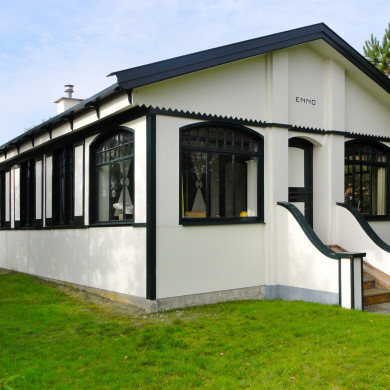 De RECREATIEWONING Enno te Schiermonnikoog staat aan de westzijde van de Badweg die sinds het begin van deze eeuw werd bebouwd, toen het toerisme zich hier begon te ontwikkelen. De Badweg loopt vanaf het dorp in noord-westelijke richting. De woning is georinteerd naar de weg en ligt enigszins achterop een opstrekkende kavel. 'Enno' is één van de woningen van eternietplaten, die in 1917 zijn gebouwd in opdracht van dhr. Timmer, eigenaar van Stoom-timmerfabriek Timmer te Groningen, voor een aantal familieleden. Enno was een zoon van Timmer; zo waren er ook onder andere 'Margaretha' en 'Jacoba'. Waarschijnlijk is het ontwerp van Timmer zelf. De Art Nouveau-elementen, die vooral in het interieur overheersen, zijn waarschijnlijk te danken aan de uitvoering van de bouw door Belgische vluchtelingen (W.O.-I) die op het eiland verbleven. 'ENNO' is de enig overgeblevene van de reeks familiewoningen. Oorspronkelijk was de kavel dieper en bevatte deze een achter op het land gelegen theehuisje. Wijzigingen dateren van kort na de bouw: de openingen in de veranda aan de voorzijde zijn in 1918 met vensters dichtgezet, en een achteraanbouw is in ongeveer 1927 in dezelfde trant geplaatst.