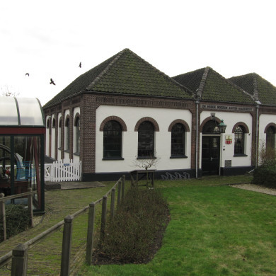 Bij de voorgevel (noord) bestaat de linker travee uit drie rondboogvensters en de rechter uit twee. De middelste travee heeft rechts een rondboogvenster en links een dubbel deur met een rondboogvormig, van gietijzeren tracering voorzien bovenlicht. Tegen de hardstenen sluitsteen van de rondboogvormige ontlastingsboog is een ijzeren lantaarn bevestigd. Rechts van de deur is een stichtingssteen ingemetseld met de tekst: "S.I. van NOOTEN/11 mei 1872".