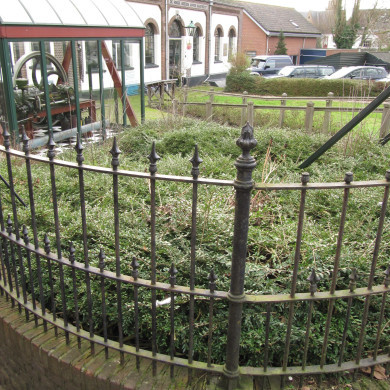 Het gemaal staat iets terug van de dijk, waarbij een ijzeren hekwerk langs de Hoogstraat de erfafscheiding vormt.