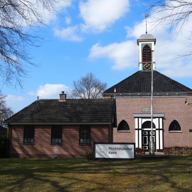 ZAALKERK (1850-1851) in Ambachtelijk-traditionele bouwstijl, van vier traveeën op rechthoekige plattegrond, opgetrokken in bruine baksteen en gedekt door een met zwarte Friese golfpannen belegd schilddak. Op de nok aan de voorzijde een dakruiter onder koepeldakje.