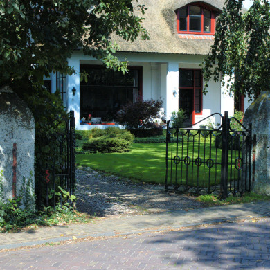 Laag dorpshuis onder schilddak met twee hoekschoorstenen waarop borden; omlijste ingang, zesruitsvensters, versierde kroonlijst.