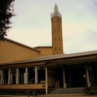 STUDIOGEBOUW van de NCRV met bijbehorende FIETSENSTALLING in Dudok-trant, gebouwd in de periode 1938-1941, naar ontwerp van de architect J.H. van der Veen uit Amsterdam. In de hal een groot glas-in-lood drieluik uit 1940, ontworpen door de glazenier Max Nauta. Het gebouw bevatte oorspronkelijk één grote en vijf kleinere studio's, gegroepeerd rond een centraal gelegen omroeperscel, die aan het exterieur wordt geaccentueerd door de hoge toren. Via een onderaardse gang werd de verbinding met de naastgelegen Villa Henriëtte tot stand gebracht, die als kantoor werd ingericht. Het studiogebouw ligt in geaccidenteerd terrein, met voor de zuidgevel een rechthoekige vijver waar het terras voor de middenrisaliet insteekt. N.B. De na-oorlogse uitbreiding van het studiogebouw aan de oostgevel valt buiten de bescherming.