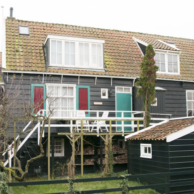 Woningblok met vier woningen, gebouwd op een rechthoekig grondplan en bestaande uit een circa twee meter hoge onderbouw in baksteen met daarop een houtskeletbouw van één bouwlaag met pangedekt zadeldak en houten gootlijsten op klossen.