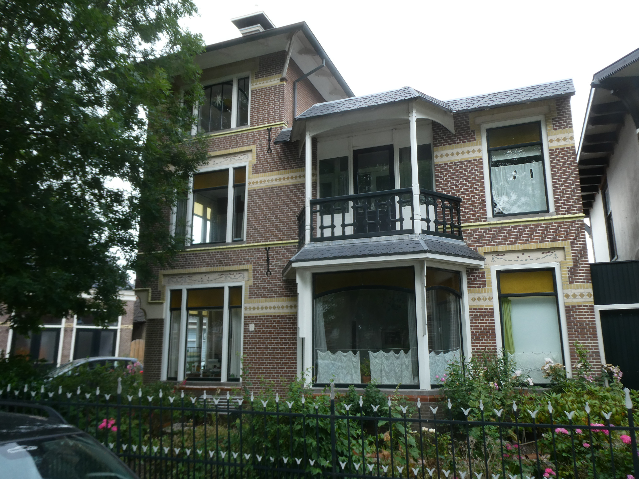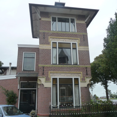 De westgevel is trapsgewijs opgebouwd door een laag bouwonderdeel met blinde muur, rechts ervan een bouwonderdeel van één bouwlaag met plat dak, verder een bouwonderdeel van twee bouwlagen -waarin zich de voordeur bevindt- en het drie bouwlagen hoge torengedeelte. De gevel wordt op dorpelhoogte door vier brede banden in gele bakstenen met een gemetseld ruitenmotief verlevendigd. Links van de voordeur bevinden zich twee vensters met strek. De houten voordeur met luifel en het venster hierboven zijn niet origineel. In het torengedeelte bevinden zich op de eerste en tweede bouwlaag twee driedelige H-vensters met matglas in de bovenlichten en een rechthoekig trommelveld, omsloten door een rij gele bakstenen. Het trommelveld bestaat uit bakstenen met decoratieve beschilderingen van guirlandes en lintjes. In de derde bouwlaag bevindt zich een rechthoekig driedelig venster, waarin een halfronde roedeverdeling is aangebracht met tweedelig bovenlicht. De zuidgevel van het torengedeelte is op gelijke wijze ingericht. In de zuidgevel is in het midden een erker met balkon geplaatst en, rechts hiervan, twee H-vensters met matglas en een rechthoekig trommelveld met afsluiting in gele bakstenen. De driedelige erker is voorzien van lichtgebogen ruiten met bovenlichten. Het dak wordt gedekt door schubvormige leien. Hierboven bevindt zich het balkon met houten leuning en driedelige balkondeur. Het balkon wordt gedekt door een leiendak, dat op houten zuiltjes rust en links en rechts doorloopt als afdak van het platdak. In de achtergevel is het venster vervangen; de deur van de bergplaats/bijkeuken is origineel. In de oostgevel bevindt zich een zij-ingang.