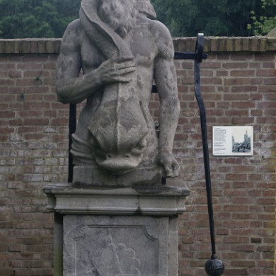 Vrijstaande, hardstenen DRINKWATERPOMP bestaande uit een holle sokkel met vierkante plattegrond, waarop een in halve lijve weergegeven figuur met dolfijn van massief hardsteen. Aan drie zijden van de hardstenen sokkel met geprofileerde plint zijn licht verdiepte velden aangebracht, waarvan de hoeken zijn versierd met schelpmotieven. In het midden van elk van deze velden bevindt zich in licht reliëf een vlakke rozet. Aan de achterzijde een kleine smeedijzeren deur, waarachter de leidingen. De figuur op de sokkel is afgebeeld als een bebaarde man met lauwerkrans om het hoofd en een draperie rondom het onderlichaam. Midden voor het lijf bevindt zich een dolfijn met opengesperde bek waarvan de staart op de rechterschouder van de man rust, achter de nek langs. De kop van de dolfijn bevindt zich onderaan, voor de buik van de man. De dolfijn dient als uitloop van het water. In de dekplaat en onder in de rug van de man een gat ten behoeve van het pompkanaal. Het geschilderde, smeedijzeren zwengelmechanisme bevindt zich tegen het achterlijf van de man. In de sokkel een leiding voor de aan- en afvoer van het drinkwater.
