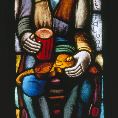 Aan bovenzijde van het portaal in de topgevel van het middenschip een rond glas-in-lood venster.