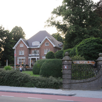Middendeel LINKERZIJGEVEL iets vooruitspringend en uitlopend in een topgevel met zadeldak met breed dakoverstek. In de topgevel een driedelig venster. In de eerste bouwlaag van het middendeel linkerzijgevel een halfronde erker met plat dak met hierop een balkon met bakstenen balustrades. In deze balustrade vijf openingen met hierin smeedijzeren hekjes. Balkon gaat over in een loggia: toegang met twee houten kolommen met cannelures. Op deze kolommen een houten dwarsbalk. In de erker een rechthoekige houten deur met aan weerszijden twee hoge rechthoekige vensters. Deur en venster met bovenlichten met glas-in-lood. Aan de voorzijde van de erker een breed terras met baksteen balustrade met hierop enkele stenen bollen en een hardstenen afdekking. Terras loopt door naar achtergevel. In de balustrade kleine openingen. Terras met bakstenen toegangstrapje. In de gevelvlakken aan weerszijden van de erker in de eerste bouwlaag een tweedelig venster met bovenlichten en in de tweede bouwlaag een tweedelig venster. Rechterdeel ACHTERGEVEL uitlopend in een topgevel met hierin een tweedelig venster en afgedekt met een zadeldak. Terras van linkerzijgevel loopt door tot halverwege de achtergevel. In de eerste bouwlaag van rechterdeel achtergevel dubbele terrasdeuren met zij-en bovenlichten. Aan dit geveldeel een houten luifel met plat dak rustend op vier houten kolommen met cannelures en kapitelen. Houten kolommen op bakstenen basementen. In de twedde bouwlaag van dit geveldeel een driedelig venster.