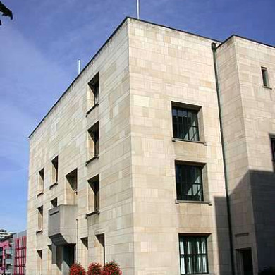 De VOORGEVEL VAN HET ADMINISTRATIEVE GEDEELTE bevindt zich aan de Geleenstraat en heeft een donkere plint en twee symmetrisch geplaatste entrees met een enkele deur. Rond de entrees zijn kleine en grotere vierkante vensters geplaatst. Centraal in de vierde laag van de gevel is een vlaggenstandaard geplaatst in de vorm van een Pancratiusbeeld van Charles Vos. De RECHTERZIJGEVEL bestaat uit een aantal volumes. Het rechter volume, ter plaatse van het administratieve gedeelte is terugliggend en bevat een rij smalle souterrain vensters, twee rijen met vierkante vensters en een rij met smallere vensters. De gevel ter plaatse van het representatieve gedeelte is meer gesloten. Deze heeft in de eerste laag een rij vensters en een halfronde erker met hoge, smalle vensters ter plaatsen van de burgemeensterskamer. Links van dit gedeelte bevindt zich een risalerend volume ter plaatse van een trappenhuis met drie kleine, smalle vensters. Geheel links nog een geveldeel met drie vierkante vensters.