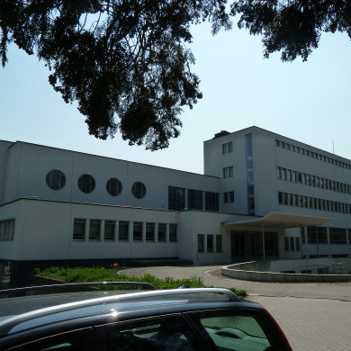 HOOFDVOLUME met in de frontgevel in de souterrainverdieping kleine rechthoekige vensters. In de eerste bouwlaag vensters met grote kunststof kozijnen. In de tweede en derde bouwlaag een horizontale reeks rechthoekige stalen vensters. In de vierde bouwlaag een horizontale reeks kleine stalen vensters. Aan het rechterdeel frontgevel een licht vooruitspringend bouwdeel in een bouwlaag en souterrainverdieping. Entree onder een licht oplopende luifel. Luifel rust op twee stalen kolommen. Toegangstrap met stalen leuningen. Rechthoekige stalen vensters. Aan de rechterzijgevel van dit bouwdeel de verbinding naar de naoorlogse aanbouw.