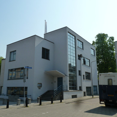 De ATELIERWONING bestaat uit twee in elkaar geschoven volumes van drie en vier bouwlagen onder platte daken. De cement-putz gevels hebben een asymmetrische gevelindeling met grote, voornamelijk liggende rechthoekige grijsblauwe stalen vensters met ongeglazuurde dorpelstenen. In de gevel bevinden zich verder rechthoekige deuren gelegen onder luifels en bereikbaar via trappen met balustrade en leuningen. De VOORGEVEL van het volume van drie lagen bevat twee brede vensterpartijen, waarvan de onderste verdiept ligt, omgeven door een borstwering. In de derde bouwlaag bevindt zich een tweedelig venster, evenals de RECHTERZIJGEVEL van dit volume. In de VOORGEVEL van het volume van vier lagen bevindt zich de entree. Een stalen deur met breed venster, is gelegen onder een luifel en aan een bordes met trap. Verder is de gevel blind.