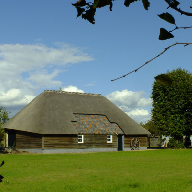 SCHUUR in ambachtelijk-traditionele stijl, uit ca. 1900 op het erf van een kortgevelboerderij.