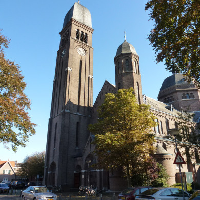 De driebeukige kruisbasiliek heeft een voorportaal geflankeerd door een hoge en een lage toren, een viering en een rondgesloten absis die wordt geflankeerd door twee torens. Het schip telt vijf traveeën. De gevels zijn opgetrokken uit machinale baksteen en geleed door spaarvelden met klimmende en rechte boogfriezen. De toren en de zij- en achtergevels hebben baksteen steunberen met afzaat en versnijding. De afzaten van de steunberen en de vensters zijn van natuursteen. De zadel, lessenaar- en koepeldaken zijn gedekt met leien in maasdekking. De hoge vierkante toren op de noord-westelijke hoek bestaat uit drie geledingen. In de eerste geleding bevindt zich aan de voorzijde een rondboogpoort. Deze heeft, net als de poorten in het voorportaal, een omlijsting van baksteen kolonnetten. Het rondbogige bovenlicht heeft baksteen tracering. Er boven is een smal hoog rondboograam. Dit is net als de overige vensters gevuld met glas-in-lood. De tweede geleding wordt aan boven en onderzijde gescheiden van de overige door een brede waterlijst. In een rondbogig spaarveld is een hoog smal rondboograam opgenomen en een ronde wijzerplaat. De bovenste geleding is laag en heeft drie gekoppelde rondbogen met galmgaten, onder de geprofileerde gootlijst is een smal rondboogfries aangebracht. Op de hoge ingezwenkte klokvormige spits staat een sierkruis. Rechts van de toren is een topgevel met daarvoor een voorportaal met drie rondbogige vleugeldeuren met sierbeslag. In de rondbogige bovenlichten weer baksteen tracering. De middelste poort wordt afgesloten door een topgevel met kruis. De lagere poorten sluiten door middel van een lessenaardak aan op het middenschip. In het muurwerk hiervan is een roosvenster geplaatst met een baksteen sierlijst. Daar onder een reeks van zes gekoppelde rondbogen. In de topgevel met klimmend rondboogfries staat een klein rondboogvenster. Op de zuidwestelijke hoek staat de lage achthoekige toren.