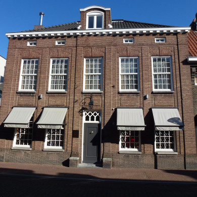 Statig HERENHUIS uit 1825. Pand met verdieping, houten kroonlijst, attiek boven de middenrisaliet, waarop een vierkant klokkentorentje en leien schilddak met hoekschoorstenen. Deuren met ronde en ovale panelen, bovenlichten pilasteromlijsting met hoofdgestel.