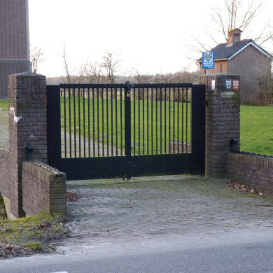 De erfscheiding heeft een samengestelde constructie bestaande uit een dam over de erfsloot waarop een hekwerk. De dam bestaat uit beton waarop aan weerszijden een bakstenen balustrade waarop een ijzeren band in T-profiel met golfrand. In het midden van de balustrade staat een opgemetselde kolom waaraan de geklonken ijzeren hekken met spijlen draaien.