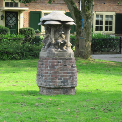 De sculptuur die ter herinnering aan de bouw is geplaatst, is in totaliteit circa 1.80 meter hoog en bestaat uit een achtzijdige bakstenen sokkel van circa 0.80 meter hoogte met daarop een circa 1.00 meter hoog natuurstenen beeld. Dit natuurstenen beeld is in hoofdvorm eveneens achtzijdig en geeft vier figuren weer die schuilen onder paddestoelen. In het oostelijk vlak van het beeld is een schuilende mannelijke figuur met ramshoorns afgebeeld. In het noordelijke vlak is een naakte vrouwelijke figuur die schuilt afgebeeld. In het westelijke vlak is de schuilende figuur een kabouterachtige en in het zuidelijk vlak wederom een naakte vrouwelijke figuur. In de achtzijdige plint van het natuurstenen beeld staat in de noordelijke zijde de inscriptie: "Schultsz. Amsterdam".