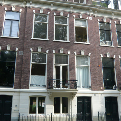 In het midden van elke travee bevindt zich ter hoogte van de eerste verdieping een houten balkon gedragen door rijk bewerkte consoles van stucwerk. De balkons bezitten een sierlijk gesmeed ijzeren hekwerk. De entree van elk der drie herenhuizen bestaat uit een dubbele houten voordeur met gietijzeren sierroosters. De entrees zijn niet symmetrisch in het midden van de traveeën gelegen, maar in de derde, zesde en zevende vensteras.