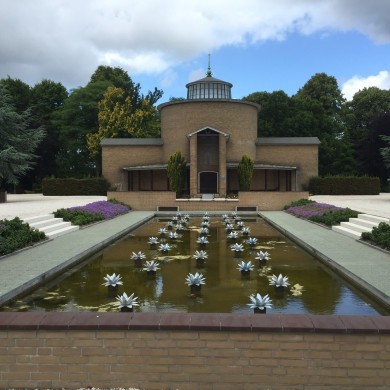 Traditionalistische AULA op de Noorderbegraafplaats, gebouwd in 1936 naar ontwerp van G. Friedhoff. De vormgeving is geïnspireerd op de Bornholmse rondkerken, een Scandinavisch bouwtype uit de twaalfde eeuw. De aula is prominent gesitueerd aan het eind van een rechte brede oprijlaan met middengazon en vijver die de Noorderbegraafplaats vanaf de Vergierdeweg ontsluit.