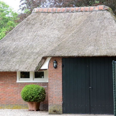 GARAGE op L-vormige plattegrond waarvan de gevels boven een plint van grijsbruine baksteen zijn opgetrokken in bruine baksteen. De nok van het samengestelde rietgedekte schilddak is voorzien van oranje vorstpannen. In de gespiegelde oost- en westgevel garagedeuren en direct onder het dakschild horizontale drieruits vensters. Links van de derde garagedeur in de zuidgevel een opgeklampte deur.
